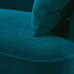 Revêtement : velours 100% polyester coloris bleu pétrole, coussins d’accompagnement déhoussables (structure non déhoussable)